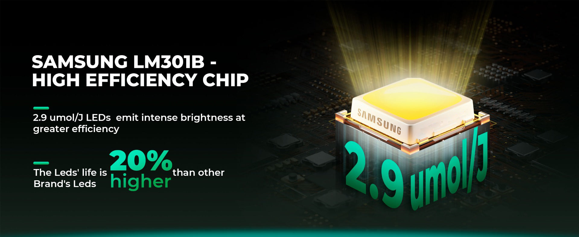 - Professional Samsung LED Grow Light: The ASP-800 800 watt LED grow light boasts cutting-edge Samsung LM301B diodes that drive its high-performance capabilities. The advanced chips help the ASP800 deliver a remarkable photosynthetic photon efficacy (PPE) of 2.9 μmol/j and a PPF of 2309 μmol/s high photon flux, providing a substantial and enduring lighting energy source for indoor plants. Together with a long-lasting color rendering capability, Samsung LM301B chips make sure the light spectrum emitted is consistent and stable throughout the lifespan of the product. Ideal for both personal growers and racking cultivation operators.