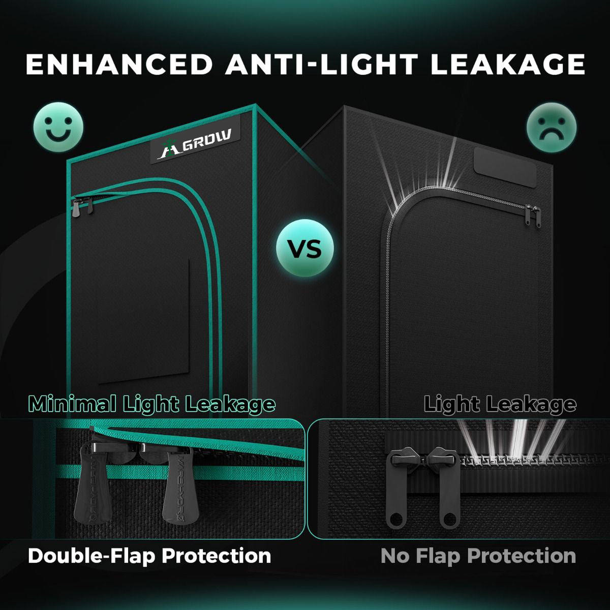 - No Light Leakage With High Reflectivity. AI-Grow's indoor grow tents feature a densely stitched canvas with a 1680D rating, which is superior to other tents that typically have 300D or 600D ratings. The heavy-duty SBS zippers on these tents are double-stitched for added durability and are now equipped with a zipper flap that effectively blocks any light from escaping the tent
